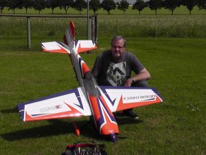 Das Bild zeigt mich mit mit dem Nachbau eines Kunstflugmodells auf dem Vereinsgelände in der Nähe von Nienburg.