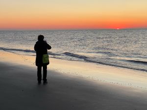 In meiner Freizeit gehe ich sehr gerne Spazieren! Egal wo: Das kann an den Fischteichen sein, die direkt vor der Haustür liegen, im Wald oder sehr gerne am Meer. Da die Myasthenie meine Ausdauer und Geschwindigkeit etwas ausgebremst hat, bin ich langsamer unterwegs und nehme mir viel Zeit für die kleinen Dinge am Wegrand, beobachte Tiere oder lasse unterschiedliche Lichtverhältnisse auf mich wirken. So entstand der Wunsch, Eindrücke bildlich festzuhalten. Ich kaufte mir eine gute Digitalkamera. Die Kamera wurde und ist mein Begleiter und ich fotografiere gerne, was mich gerade anspricht. Unterschiedliche Perspektiven einnehmen, mich an den Bildern freuen oder auch auf diese Weise auf Entdeckungstour zu gehen, macht mir echt Spaß und gibt mir viel Entspannung. Da sich auch andere über meine Bilder freuen können, gestalte ich gerne Kalender oder Fotobücher und gebe sie als Geschenk weiter. Auf dem Foto, das ich beigefügt habe, fotografiere ich gerade einen Sonnenuntergang auf Spiekeroog. Sonnenaufgänge oder Sonnenuntergänge fotografiere ich besonders gerne.