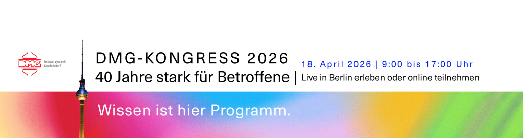 Vier Jahrzehnte Engagement, Austausch und gelebte Gemeinschaft – die Deutsche Myasthenie Gesellschaft e. V. feiert im Jahr 2026 ihr 40-jähriges Bestehen. Dieses besondere Jubiläum möchten wir gemeinsam mit Ihnen im Herzen von Berlin begehen. Unser Kongress am 18. April 2026 ist mehr als eine Veranstaltung: Er ist ein Moment, um auf das Erreichte zurückzublicken, Weggefährten und junge Forschende zu ehren und vor allem einen mutigen Blick in die Zukunft der Myasthenie-Behandlung zu werfen.